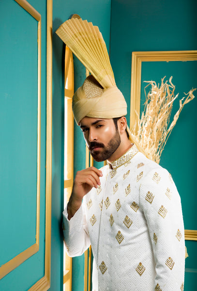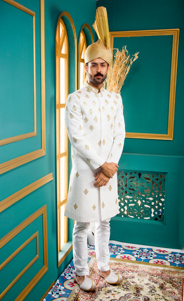 White self embroided sherwani with kora dabka filling.
