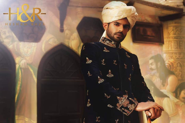 Blue velvet sherwani with hand embellishment of kora and dabka